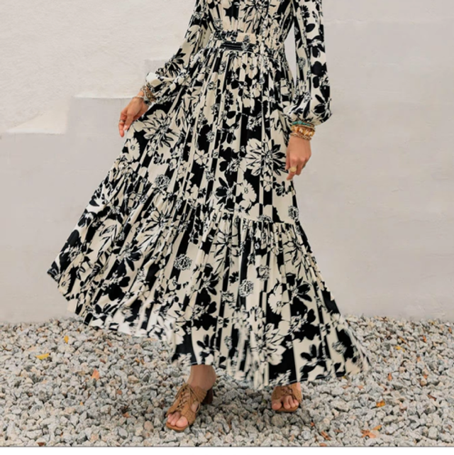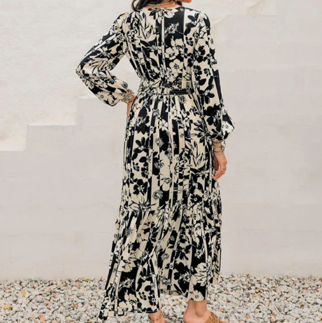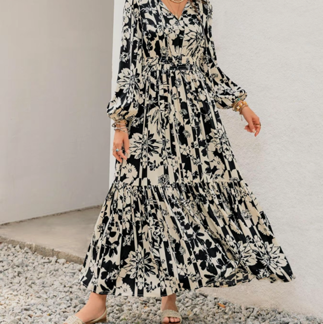 Robe trapèze à imprimer floral pour femmes,ourlet à volant et col noué,robe longue à manches !